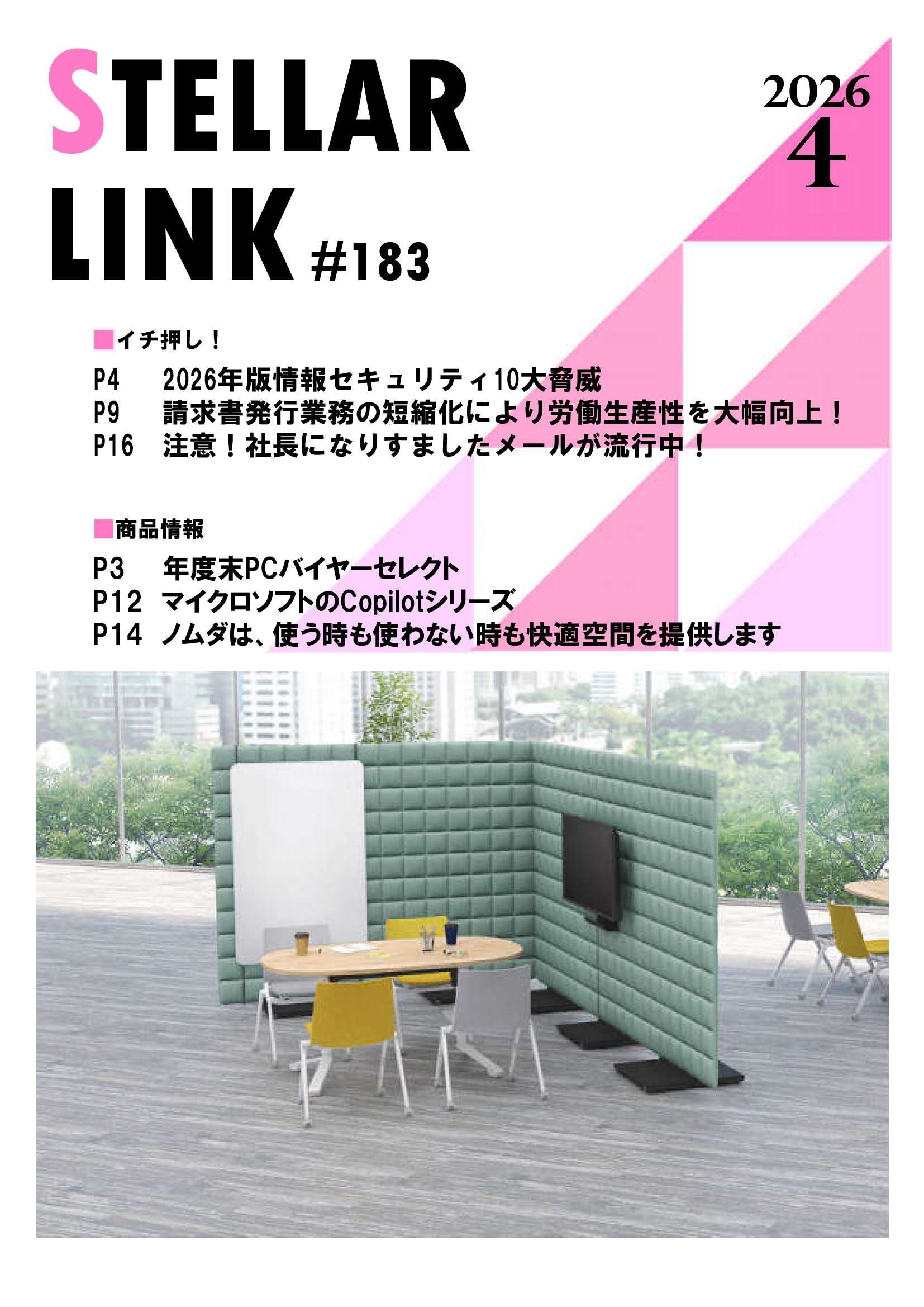 P2 STELLAR GROUP NEWS P3 年度末PCバイヤーセレクト P4 2026年版情報セキュリティ10大脅威 P6 企業の信頼を守るために、いまから取り組むべき P7 あなたの会社を、24時間365日見守ります P8 楽楽明細で実現する発行業務電子化のご案内 P9 請求書発行業務の短縮化により労働生産性を大幅向上! P10 通知物作成を効率化しませんか? P12 マイクロソフトのCopilotシリーズ P13 弊社生成AI活用事例 P14 ノムダは、使う時も使わない時も快適空間を提供します P16 注意!社長になりすましたメールが流行中! P18 変わりゆく働く場(オフィス会議はどう変わってきたのか?)